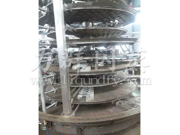濕物料自加料器連續(xù)地加到干燥器上部第一層干燥盤上,帶有耙葉的耙臂作回轉運動使耙臂作回轉運動使耙葉連續(xù)地翻抄物料。物料沿指數(shù)螺旋線流過干燥盤表面,在小干燥盤上的物料被移送到外緣,并在外緣落到下方的大干燥盤外緣,在大干盤上物料向里移動并從中間落料口落如下一層小干燥盤中。大小干燥盤上下交替排列,物料得以連續(xù)地流過整個干燥器。中空的干燥盤內通入加熱介質,加熱介質形式有飽和蒸汽、熱水和導熱油,加熱介質由干燥盤的一端進入,從另一端導出。已干物料從^后一層干燥盤落到殼體的底層,^后被耙葉移送到出料口排出。濕份從物料中逸出,由設在頂蓋上的排濕口排出,真空型盤式干燥器的濕氣由設在頂蓋上的真空泵口排出。從底層排出的干物料可直接包裝。通過配加翅片加熱器、溶劑回收冷凝器、袋式除塵器、干料返混機構、引風機等輔機,可提高其干燥的生產能力,干燥膏糊狀和熱敏性物 料,可方便地回收溶劑,并能進行熱解和反應操作。