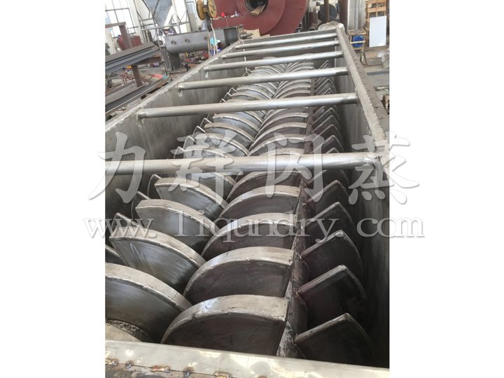 空心軸上密集排列著楔型中空槳葉,熱介質經空心軸流經槳葉。單位有效容積內傳熱面積很大,熱介質溫度從-40℃到320℃,可以是水蒸汽,也可以是液體型:如熱水、導熱油等。間接傳導加熱,沒有攜帶空氣帶走熱量,熱量均用來加熱物料。熱量損失僅為通過器體保溫層向環境的散熱。楔型槳葉傳熱面具有自清潔功能。物料顆粒與楔型面的相對運動產生洗刷作用,能夠洗刷掉楔型面上附著物料,使運轉中一直保持著清潔的傳熱面。槳葉干燥機的殼體為Ω型,殼體內一般安排二到四根空心攪拌軸。殼體有密封端蓋與上蓋,防止物料粉塵外泄而充分發揮作用。